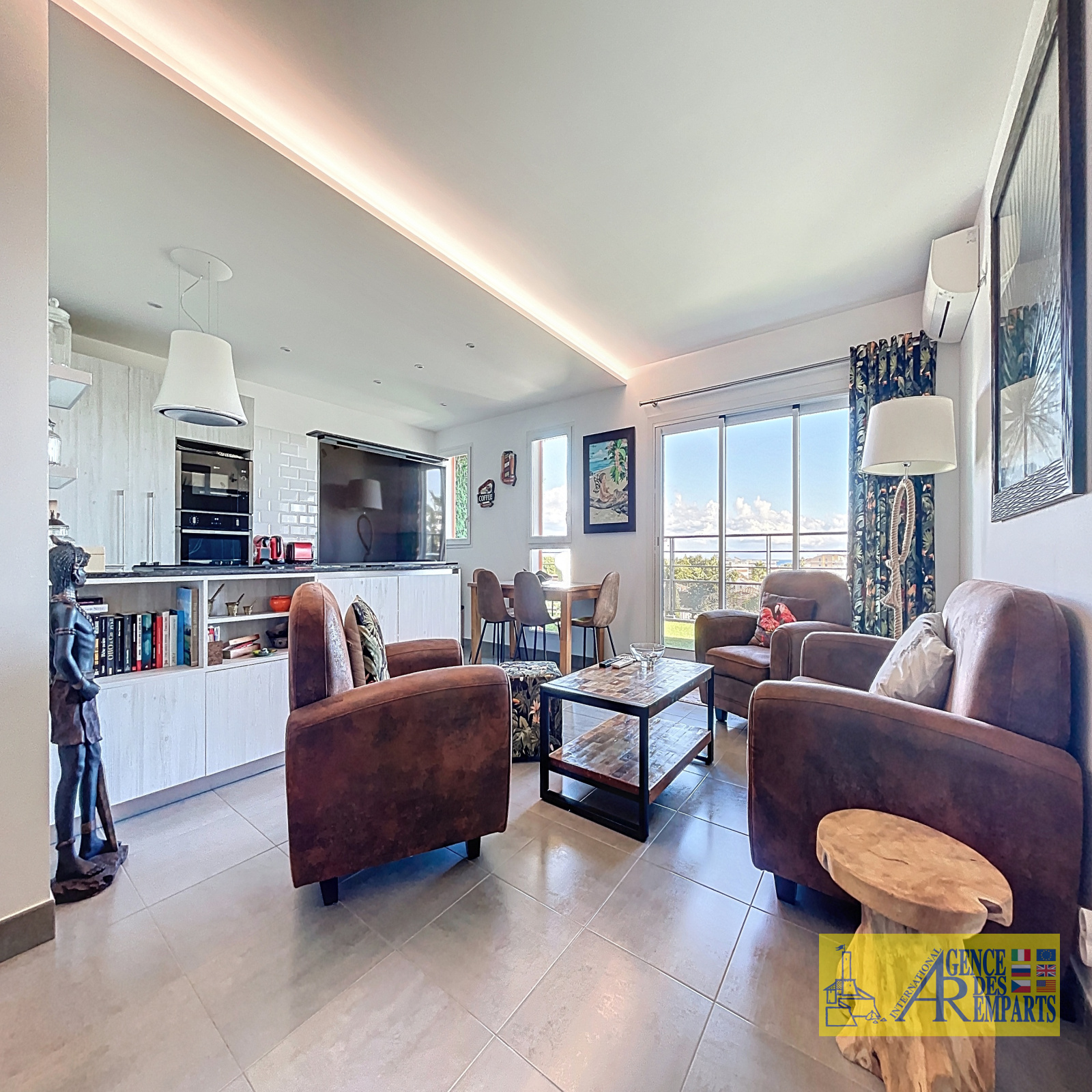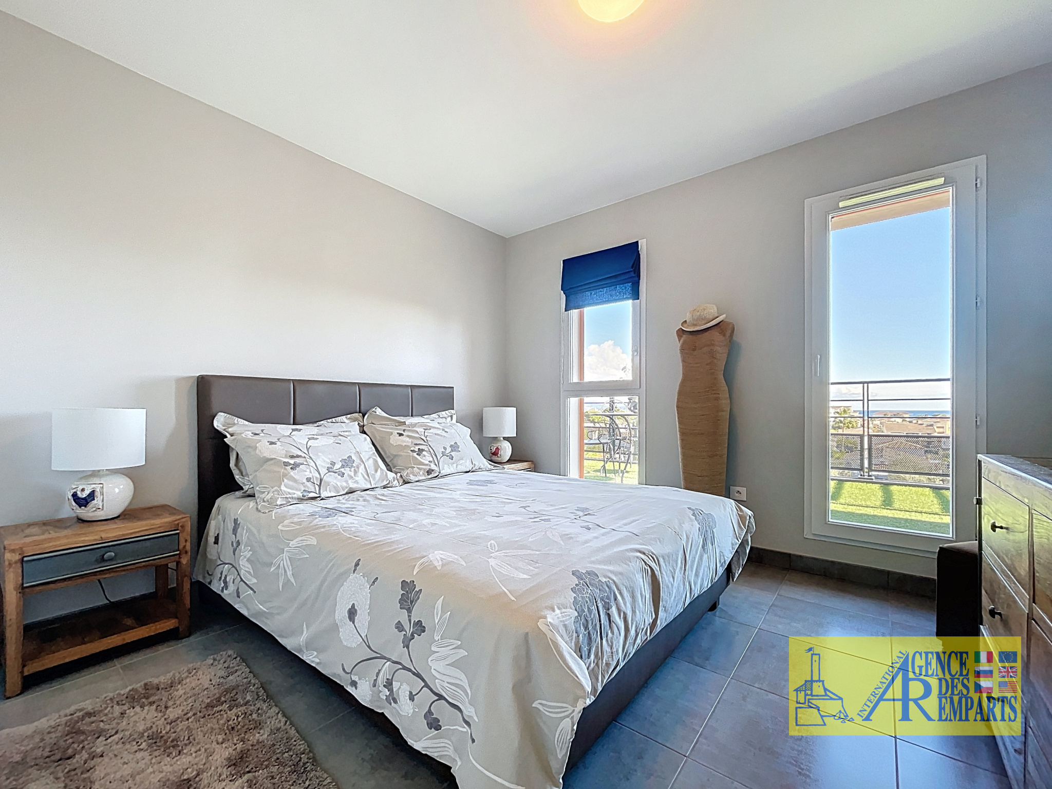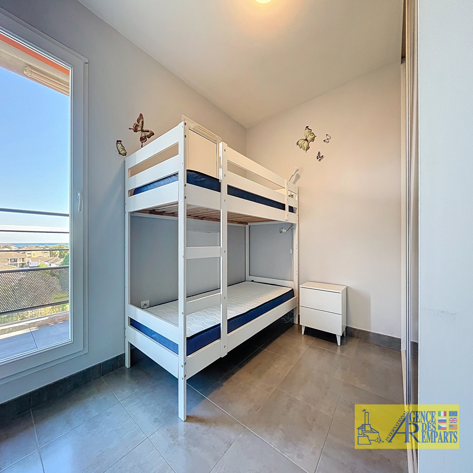 Le véritable atout de cet appartement est sa magnifique terrasse filante, qui s’étend le long de l’ensemble du logement et relie élégamment les deux chambres au séjour, offrant un espace extérieur généreux pour profiter du calme de la résidence et admirer une vue mer à couper le souffle.