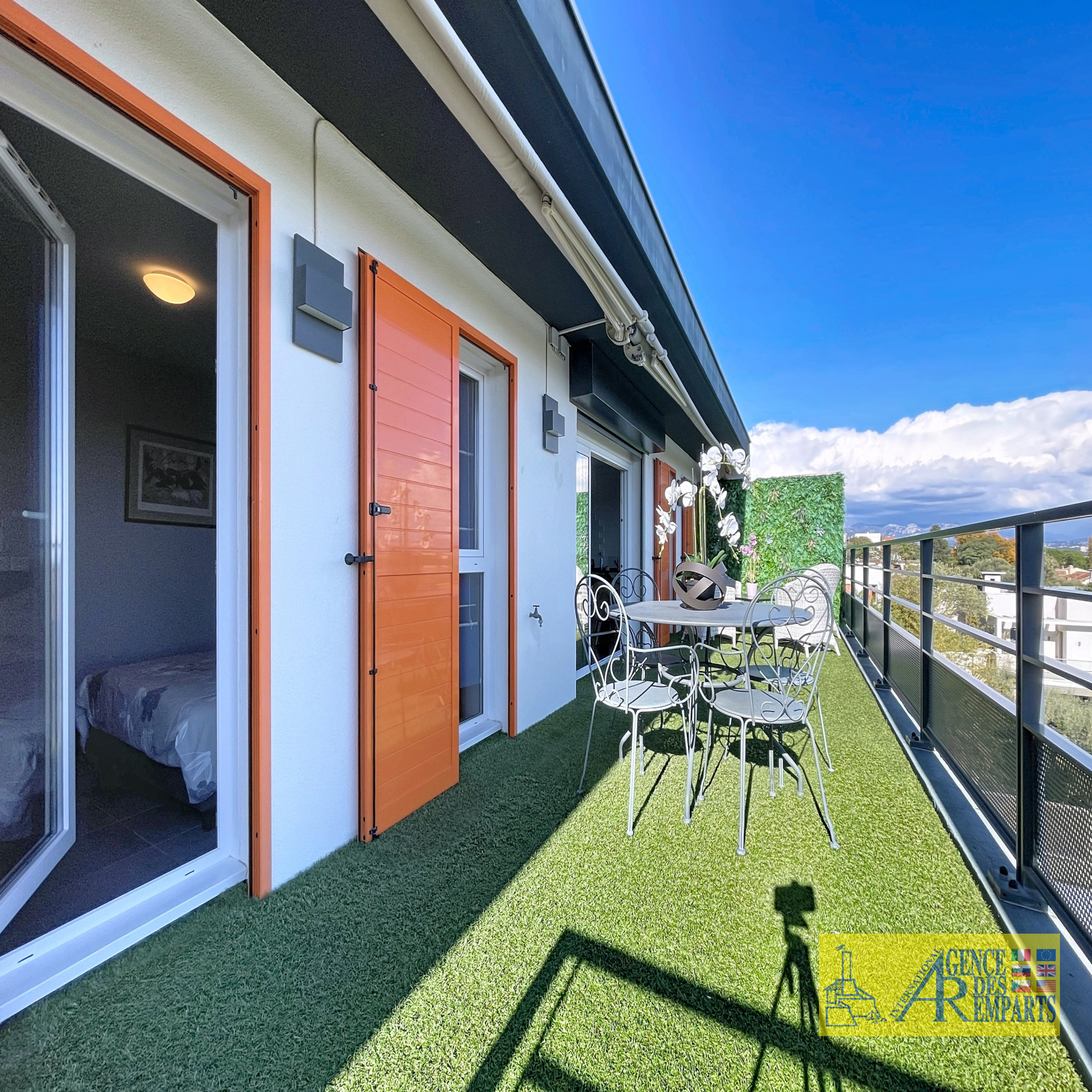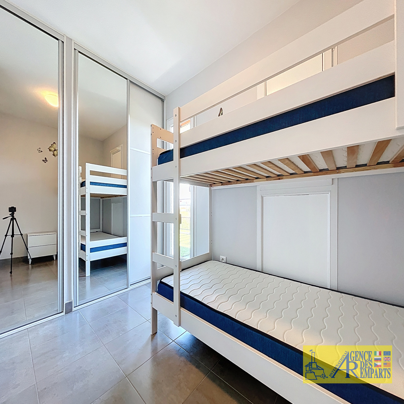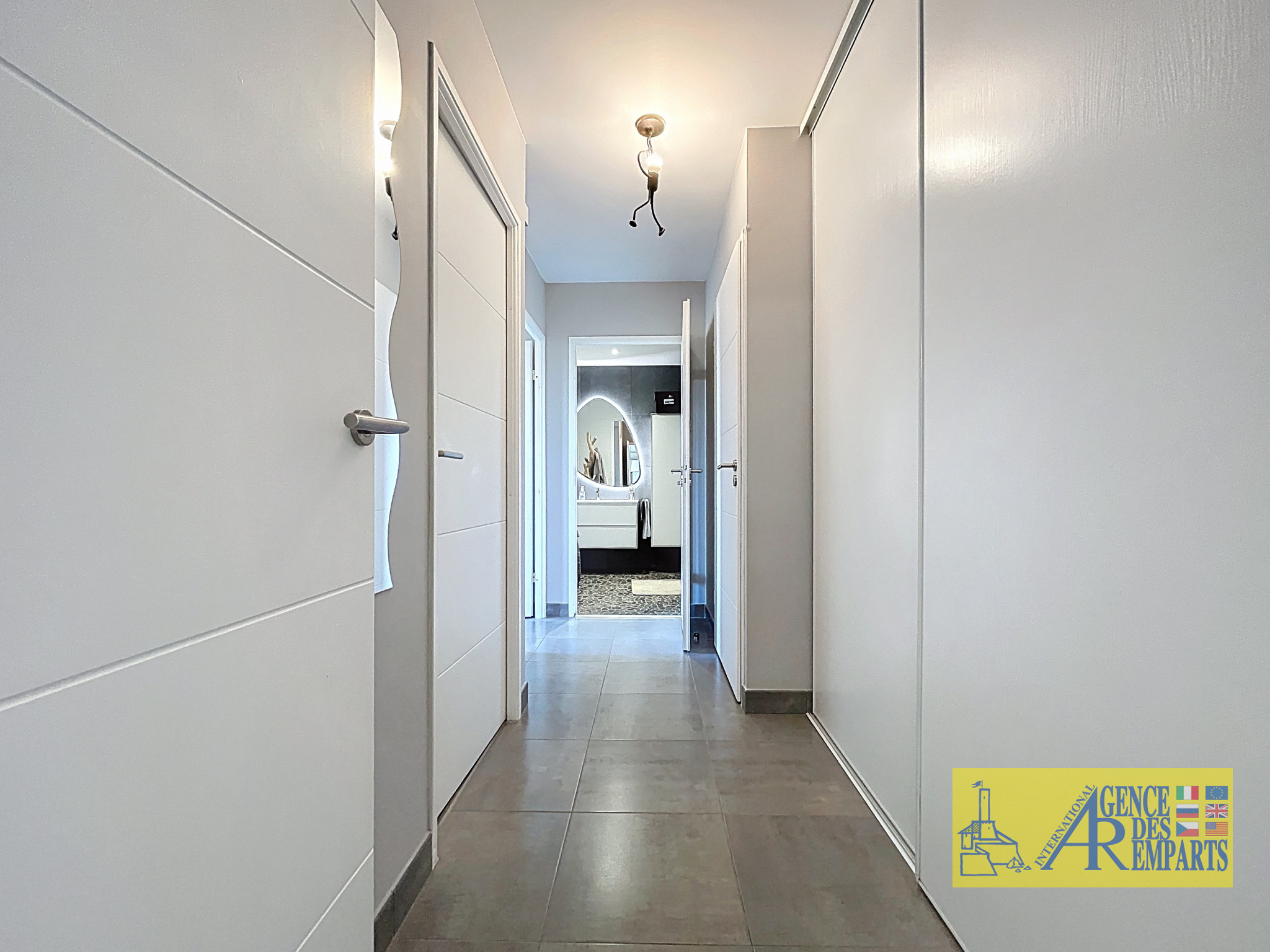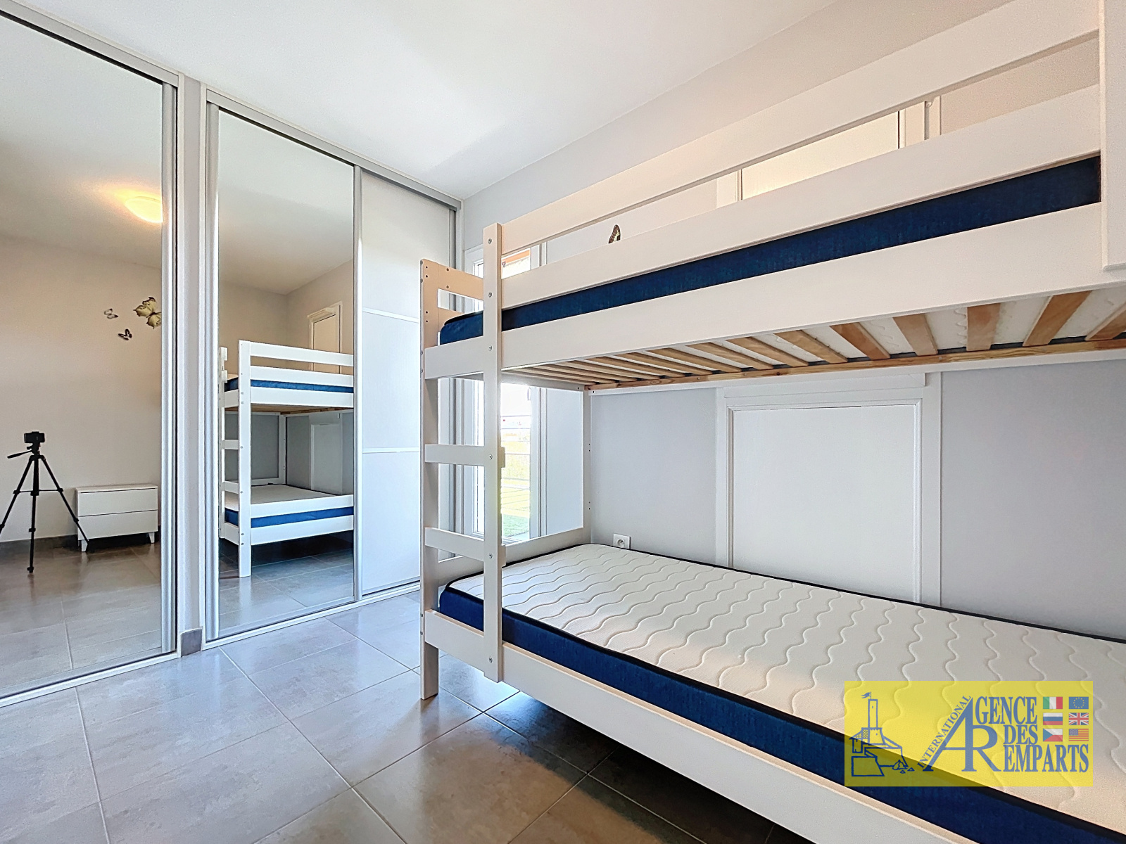 Le véritable atout de cet appartement est sa magnifique terrasse filante, qui s’étend le long de l’ensemble du logement et relie élégamment les deux chambres au séjour, offrant un espace extérieur généreux pour profiter du calme de la résidence et admirer une vue mer à couper le souffle.