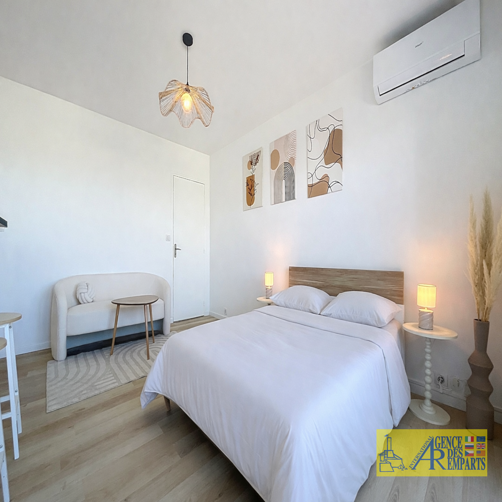 Parfaitement agencé, il se compose d’une agréable pièce de vie permettant d’accueillir un coin salon ainsi qu’un véritable espace nuit avec lit, un confort rare pour un studio. La cuisine, entièrement aménagée et équipée, dispose de tout l’électroménager nécessaire. Un espace bar complète harmonieusement l’ensemble, idéal pour déjeuner, travailler ou recevoir. Deux grands placards offrent un rangement appréciable, tandis qu’une salle de douche rénovée et des toilettes séparées viennent parfaire l’ensemble, un véritable atout au quotidien.