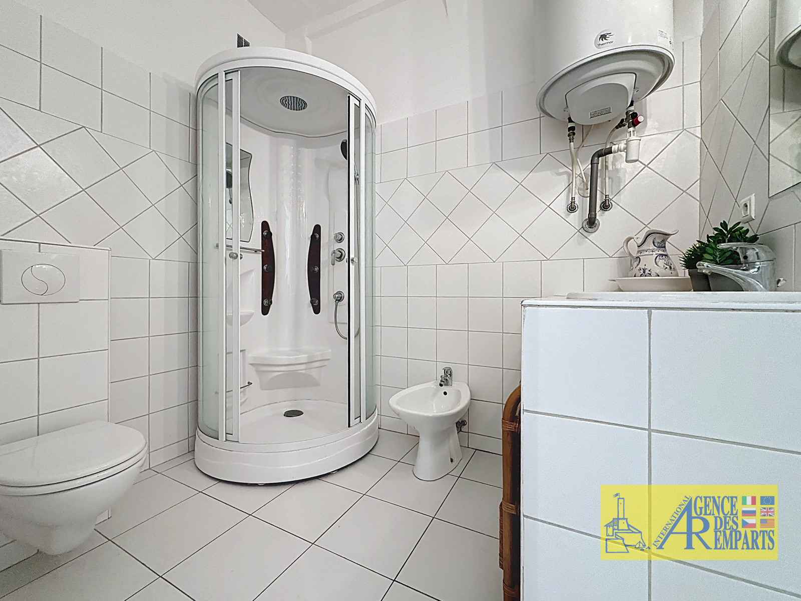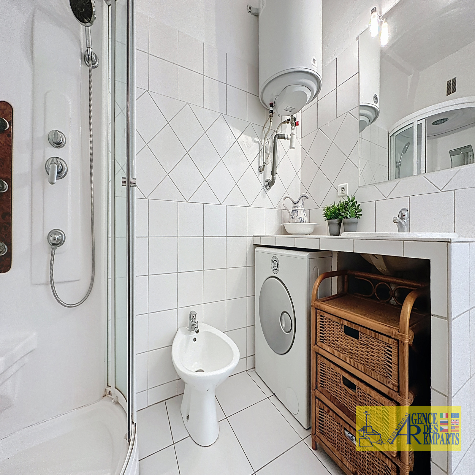 La grande salle de bain comprend également un lave-linge, apportant un confort supplémentaire au quotidien.