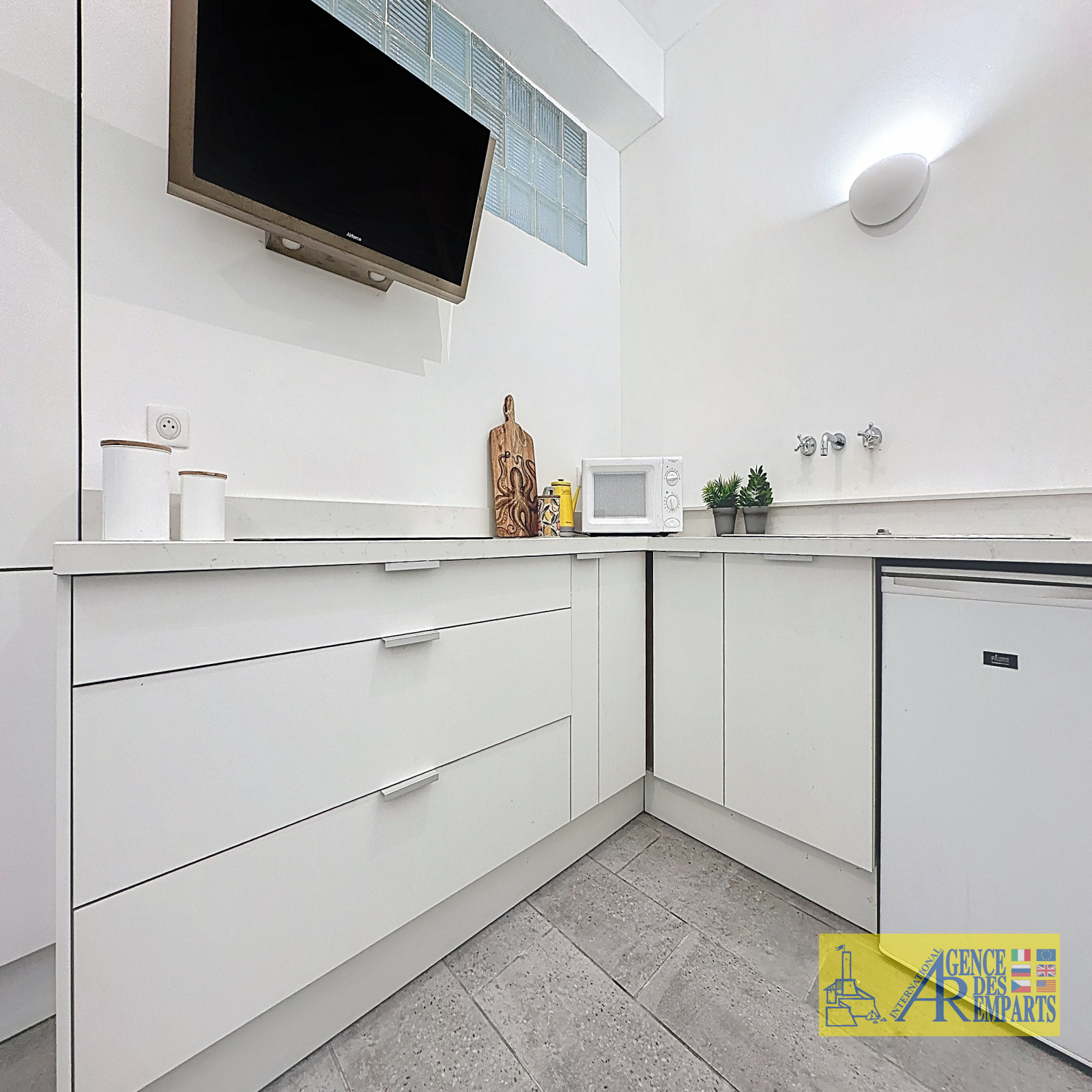 L’appartement dispose d’une belle chambre spacieuse ainsi que d’un séjour confortable pouvant facilement accueillir un canapé-lit afin de recevoir des invités. La cuisine moderne ouverte offre un bon espace de travail, parfait pour cuisiner et recevoir.