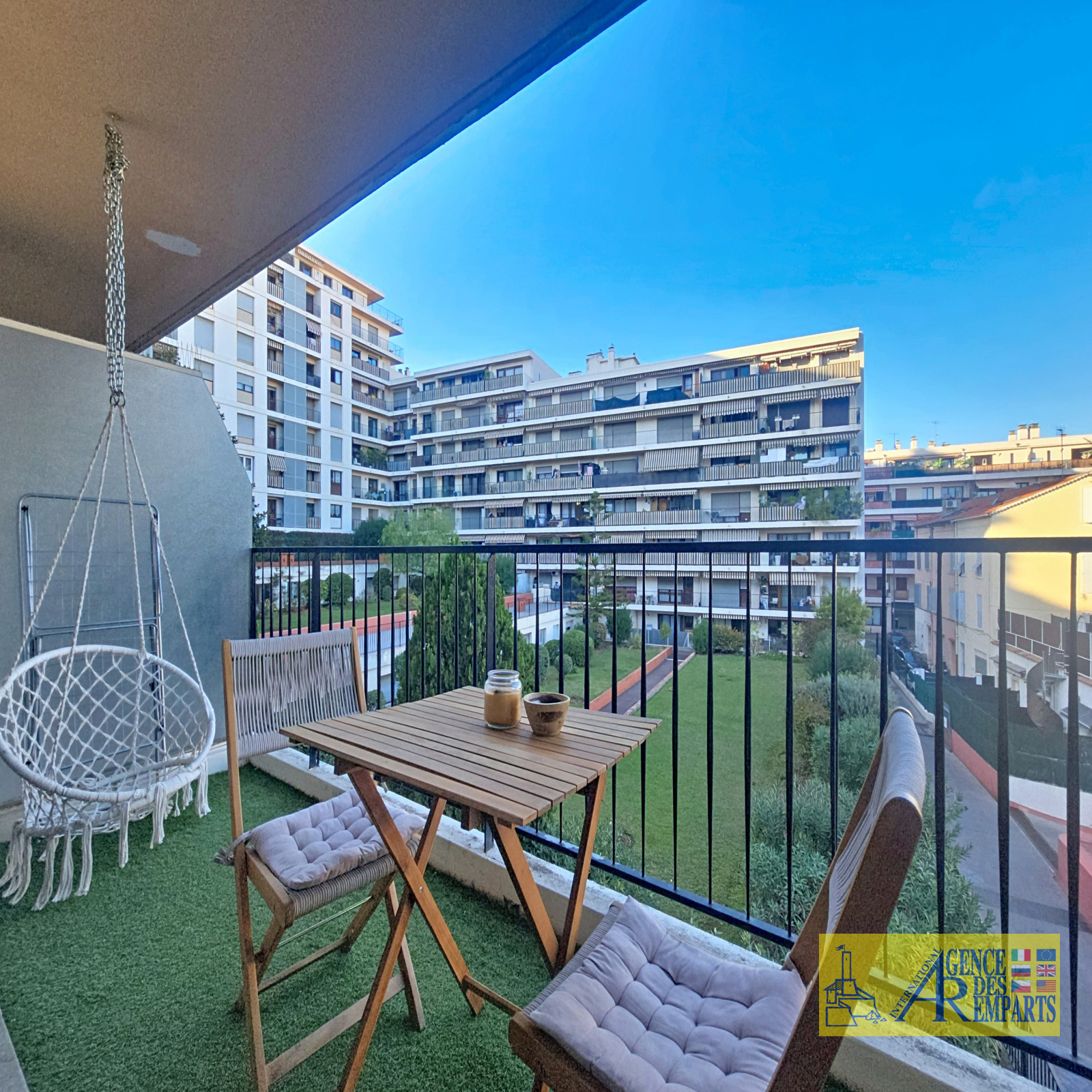 La pièce de vie lumineuse s’ouvre sur une spacieuse terrasse orientée sur le jardin verdoyant de la copropriété un havre de paix en plein cœur de Cannes.