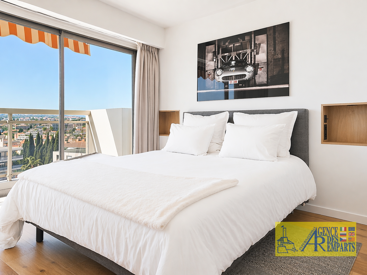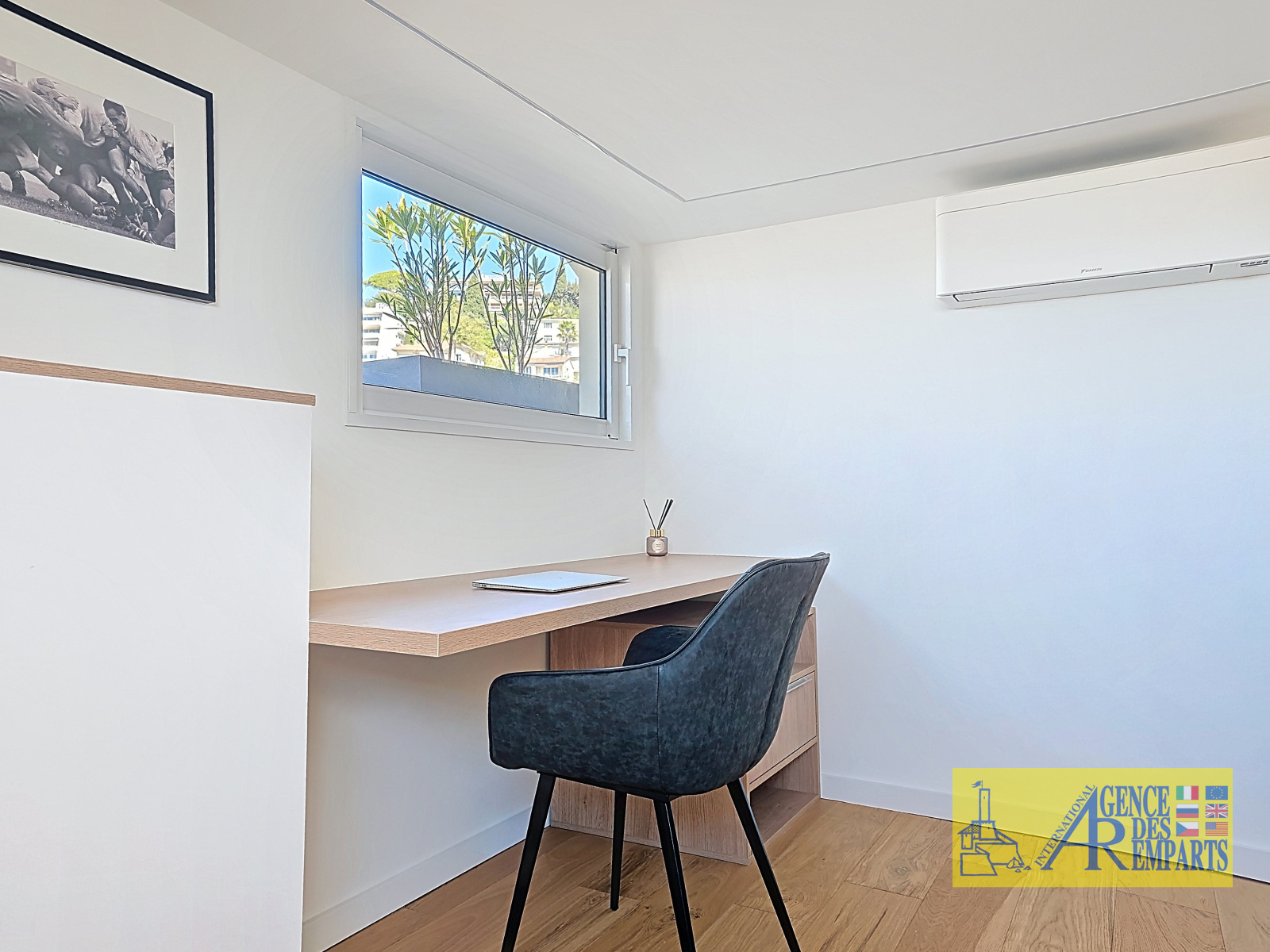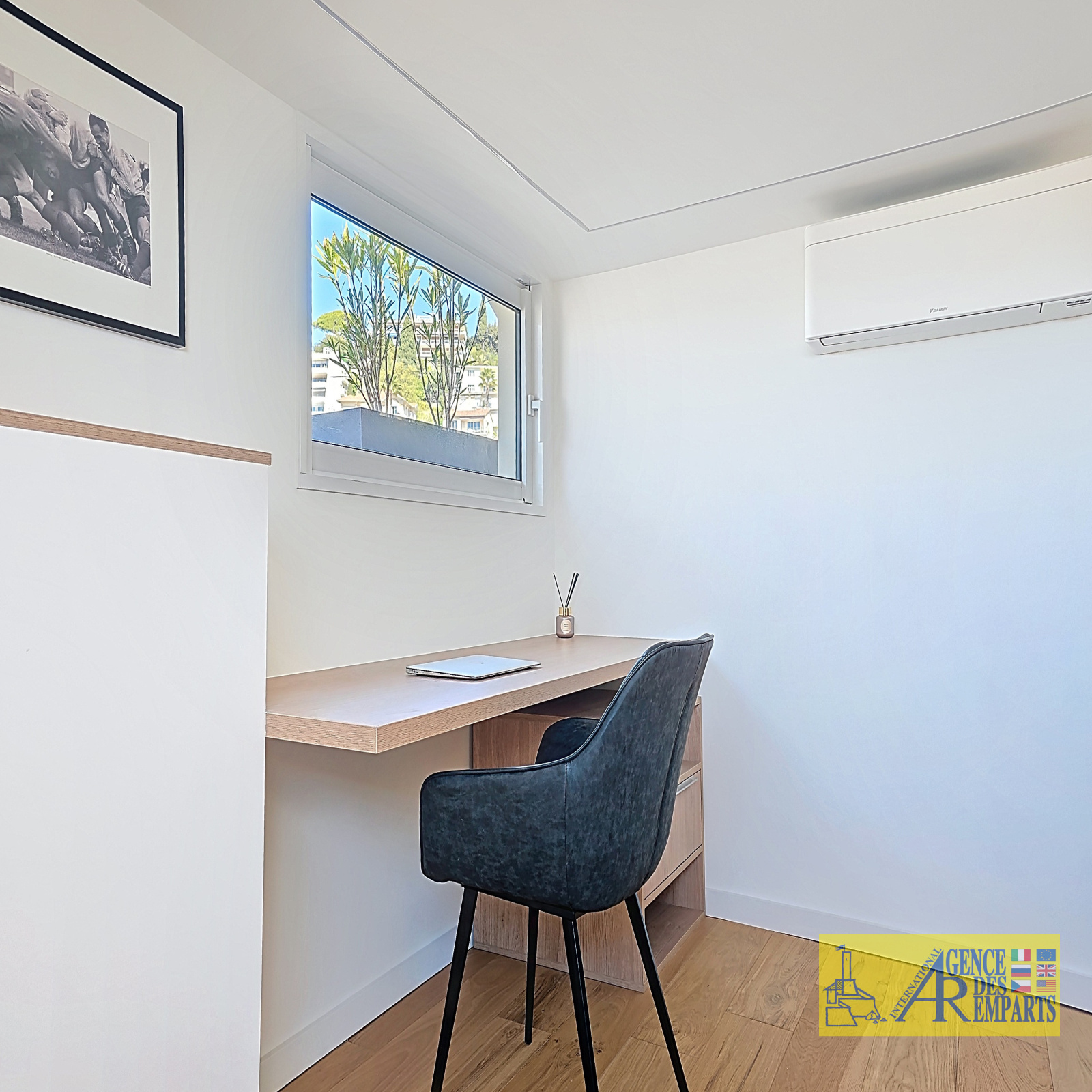 À l’étage supérieur, accessible par un escalier privatif, un bureau de 9,94 m² hors loi Carrez vient compléter harmonieusement l’ensemble, idéal pour un espace de travail, de lecture ou un usage plus personnel. Ce niveau mène surtout à la véritable signature du bien : un spectaculaire toit-terrasse en jouissance exclusive, véritable belvédère suspendu au-dessus du Cannet. Ce rooftop, absolument unique, dévoile une vue panoramique à 360° sur la mer, les montagnes, la baie de Cannes et les îles de Lérins, dans une atmosphère rare, presque hors du temps.