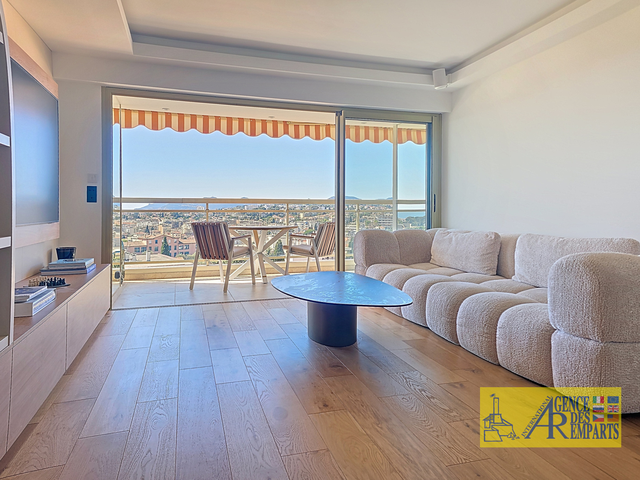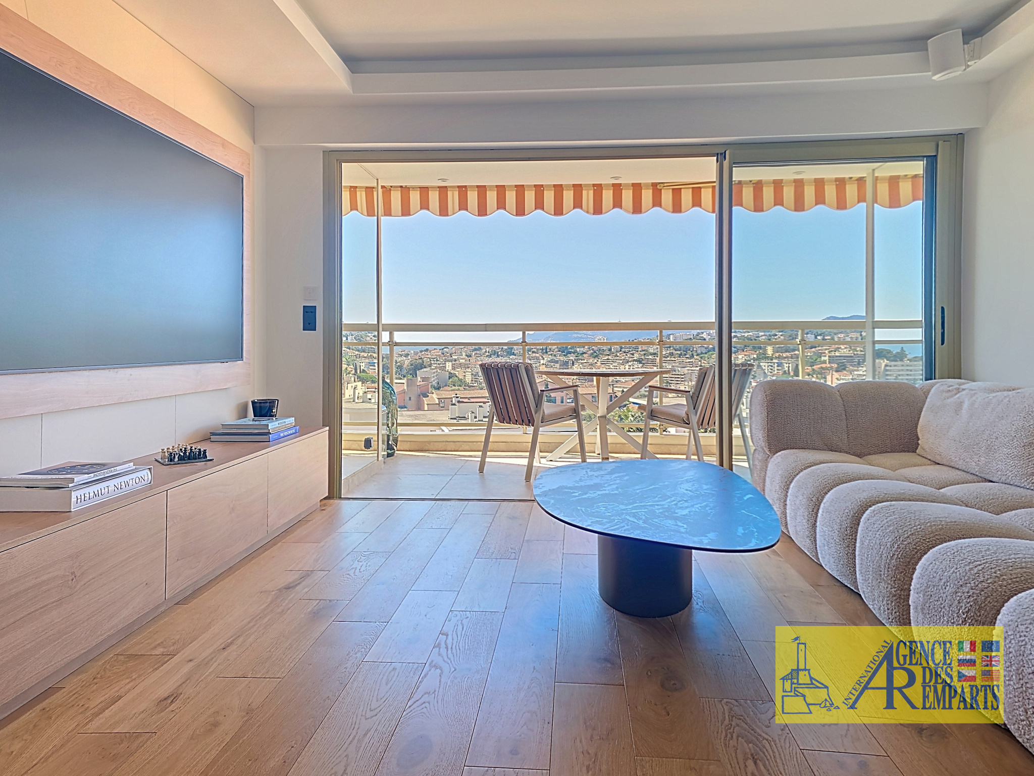 Dès l’entrée, les volumes de réception révèlent immédiatement le caractère exceptionnel du lieu. La cuisine, parfaitement équipée et subtilement intégrée, s’ouvre sur un vaste séjour baigné de lumière, prolongé par une superbe terrasse plein sud. Depuis le salon, la vue mer panoramique se déploie avec élégance sur la baie de Cannes, les îles de Lérins et les reliefs environnants. L’ensemble compose un espace de vie raffiné, fluide et résolument tourné vers l’extérieur, dans un décor spectaculaire entre mer et collines.